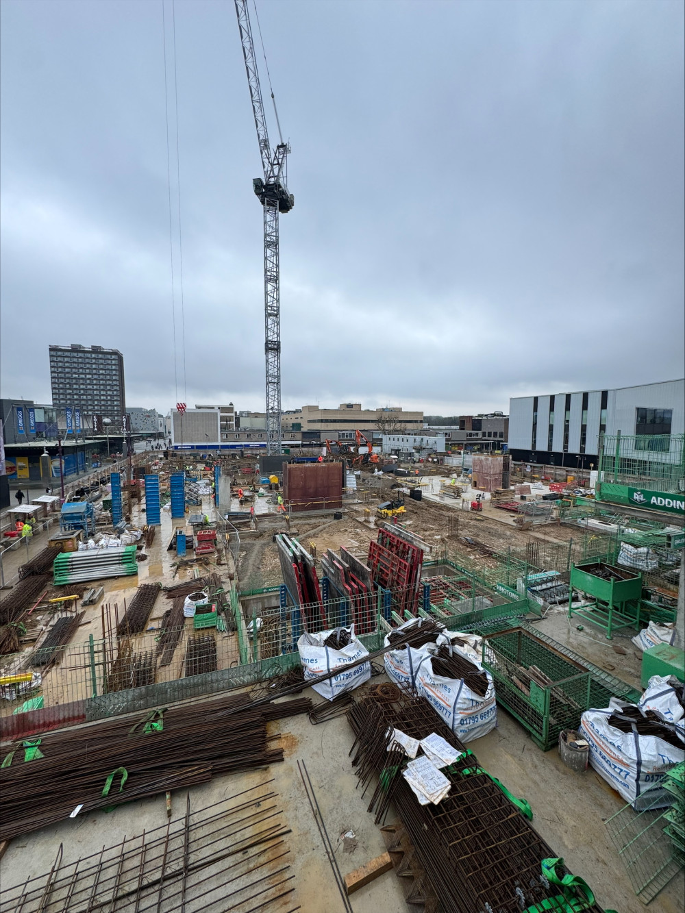CONSTRUCTION work to build 492 flats in the centre of Basildon is progressing, with cranes now looming above the site.